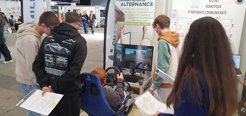 Services financiers, conseil et numérique : un simulateur de vol de drone et une démonstration de modélisation 3D ont illustré les métiers du géomètre et de la numérisation du bâtiment, portés par les bac pro de la filière MNB (Modélisation Numérique) du Lycée Charmilles ainsi que par le BTS MGTMN de SciencesTech (Métiers du Géomètre-Topographe et de la Modélisation Numérique).