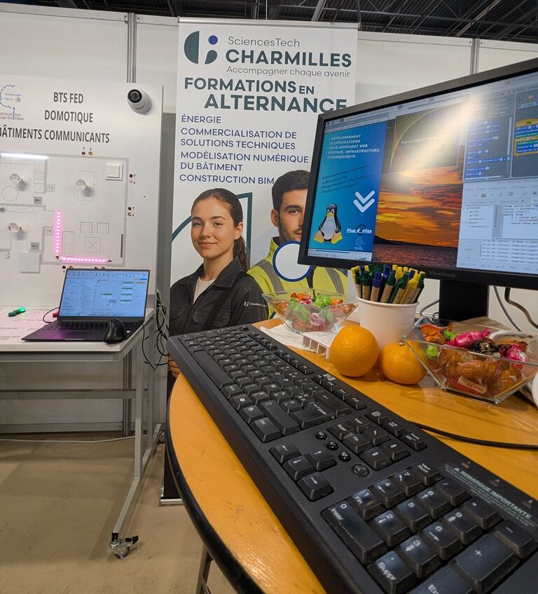 Domotique : une grande maquette interactive déployée pour parler du BTS FED DBC (Domotique et Bâtiments communicants) de SciencesTech, illustrant les systèmes intelligents pour l’habitat. On peut alors découvrir le potentiel de cet univers, ses applications, sa complexité et ses avantages énergétiques et sécuritaires. Ces automatisations inscrivent bien-sûr le bâtiment dans l’avenir ainsi que les professions qui y sont liées.